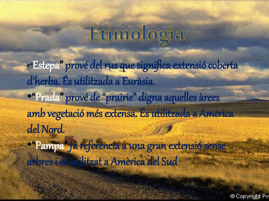 Estepes , praderies i pampes. Etimologia. “ Estepa ” prové del rus que significa extensió coberta d’herba. És utilitzada a Euràsia . “ Prada ” prové de “ prairie ” digna aquelles àrees amb vegetació més extensa. És utilitzada a Amèrica del Nord.