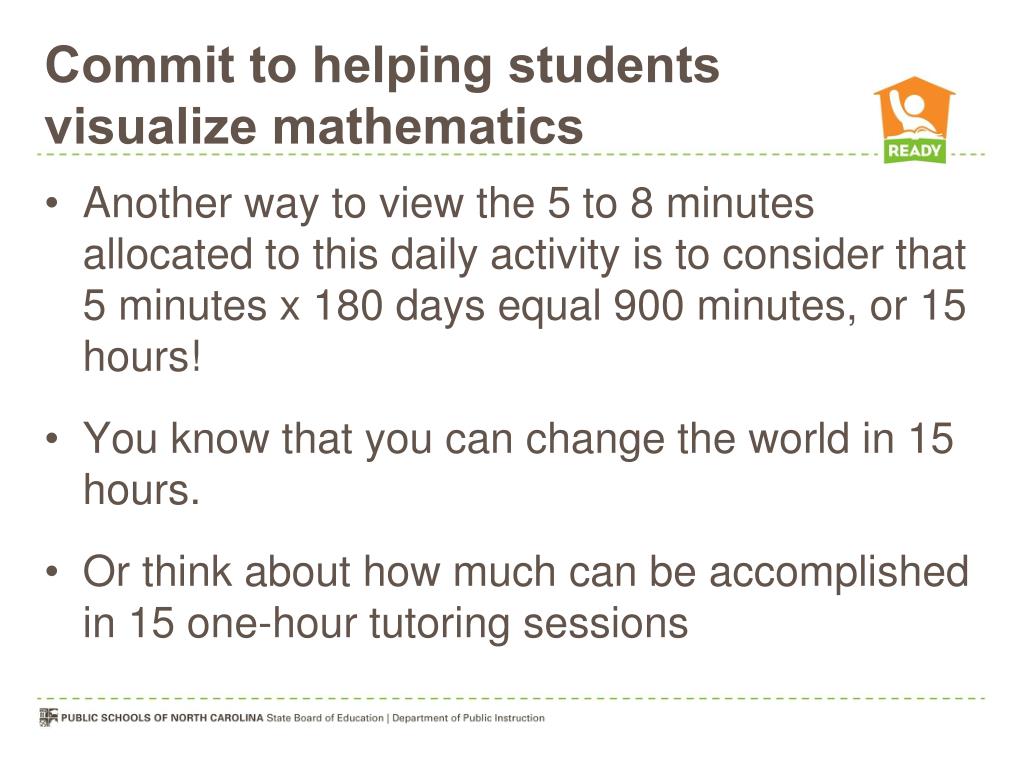 Commit to helping students visualize mathematics • Another way to view the 5 to 8 minutes allocated to this daily activity is to consider that 5 minutes x 180 days equal 900 minutes, or 15 hours! • You know that you can change the world in 15 hours. • Or think about how much can be accomplished in 15 one-hour tutoring sessions