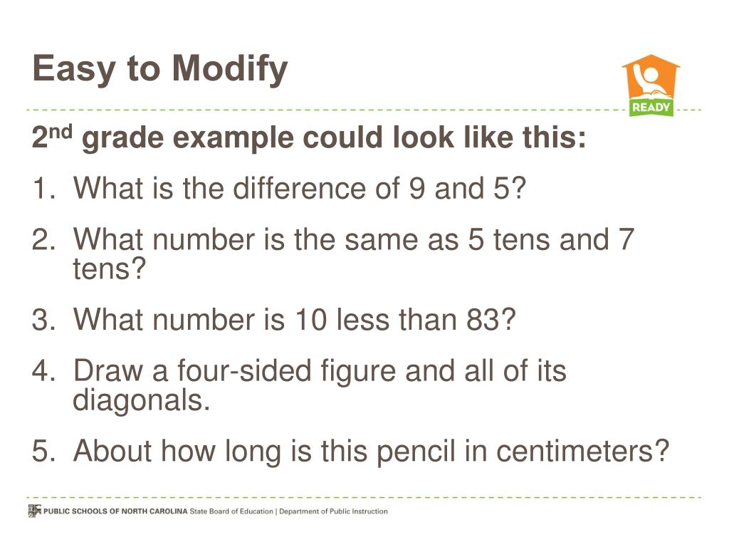 Easy to Modify 2nd grade example could look like this: • What is the difference of 9 and 5? • What number is the same as 5 tens and 7 tens? • What number is 10 less than 83? • Draw a four-sided figure and all of its diagonals. • About how long is this pencil in centimeters?
