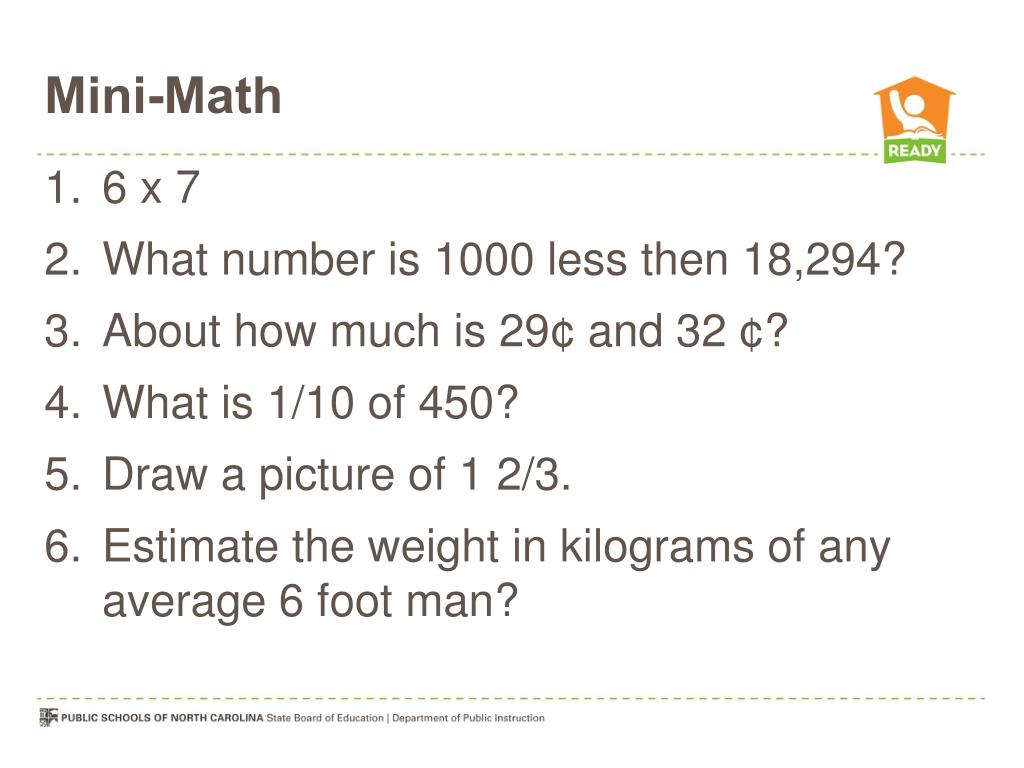 Mini-Math • 6 x 7 • What number is 1000 less then 18,294? • About how much is 29¢ and 32¢? • What is 1/10 of 450? • Draw a picture of 1 2/3. • Estimate the weight in kilograms of any average 6 foot man?