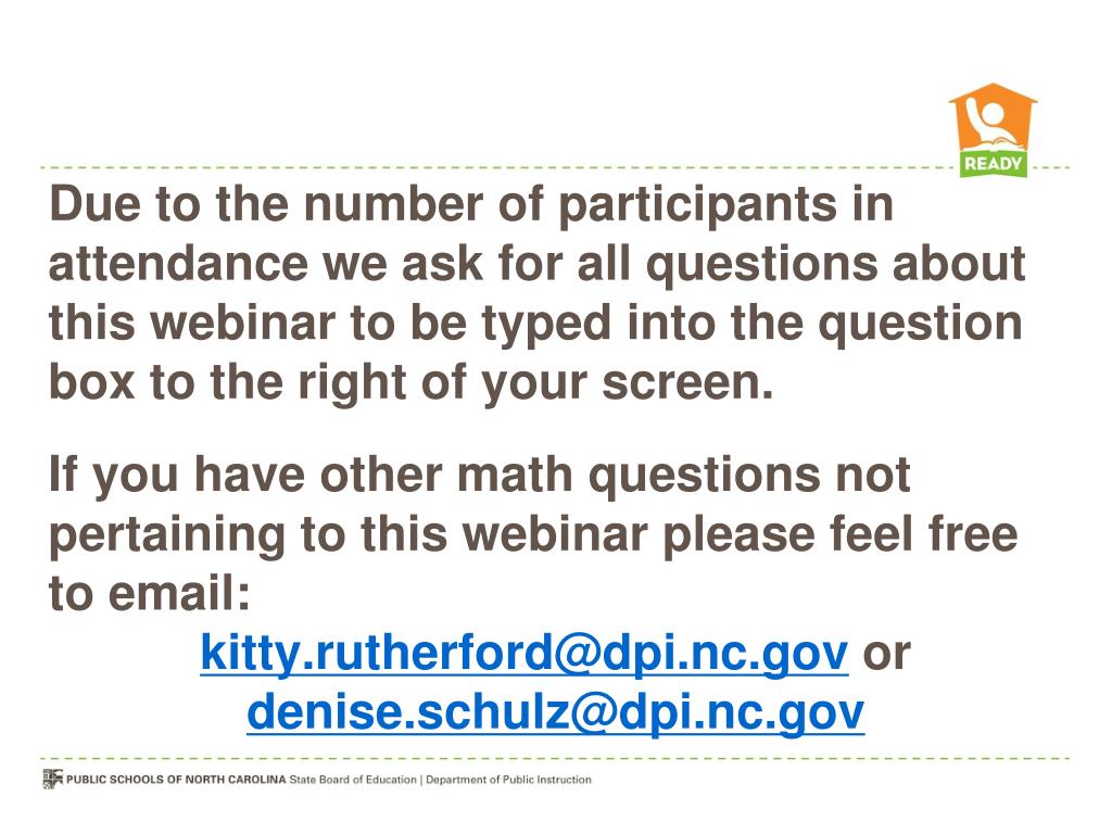 Due to the number of participants in attendance we ask for all questions about this webinar to be typed into the question box to the right of your screen. If you have other math questions not pertaining to this webinar please feel free to email: kitty.rutherford@dpi.nc.gov or denise.schulz@dpi.nc.gov
