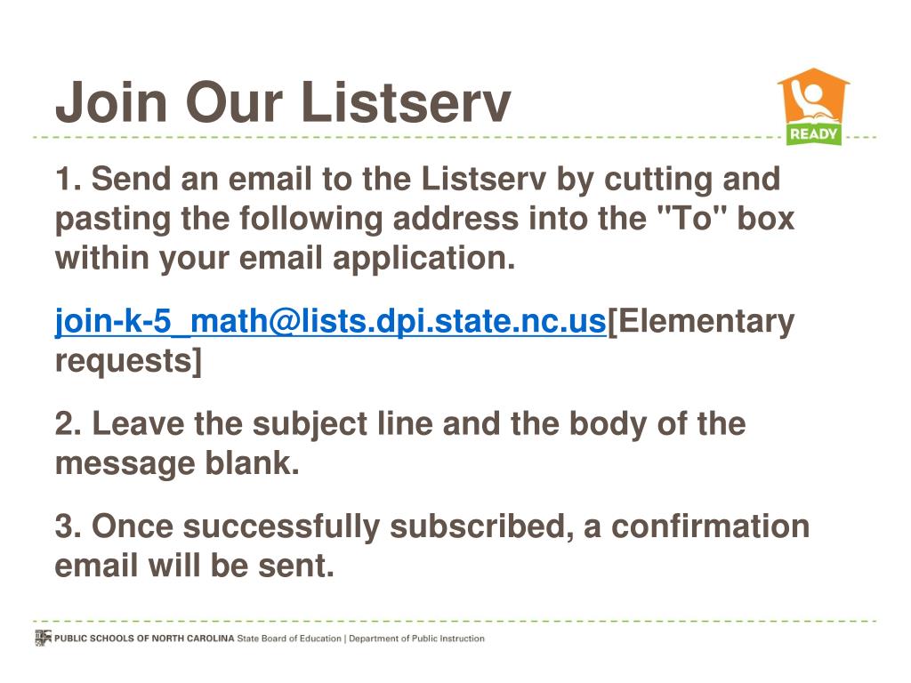 Join Our Listserv 1. Send an email to the Listserv by cutting and pasting the following address into the "To" box within your email application. join-k-5_math@lists.dpi.state.nc.us[Elementary requests] 2. Leave the subject line and the body of the message blank. 3. Once successfully subscribed, a confirmation email will be sent.