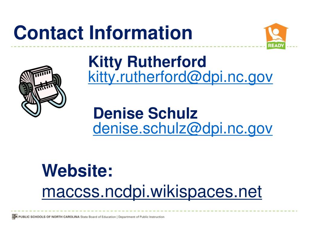 Contact Information Kitty Rutherford kitty.rutherford@dpi.nc.gov Denise Schulz denise.schulz@dpi.nc.gov Website: maccss.ncdpi.wikispaces.net