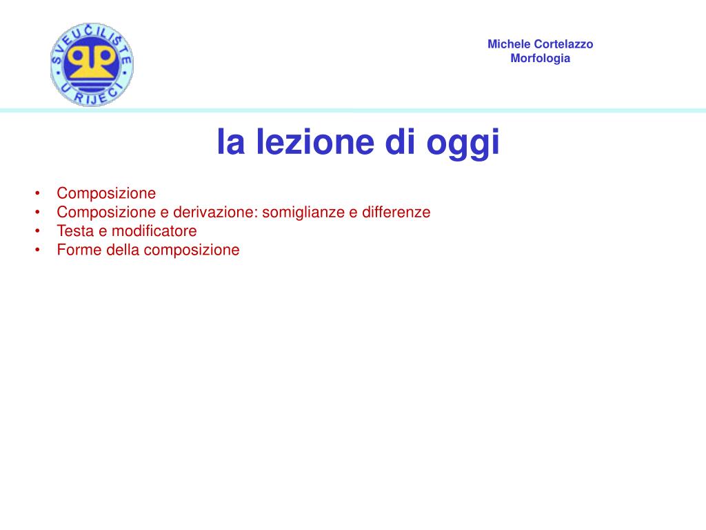 Michele A. Cortelazzo Morfologia. la lezione di oggi Composizione Composizione e derivazione: somiglianze e differenze Testa e modificatore Forme della composizione. composizione