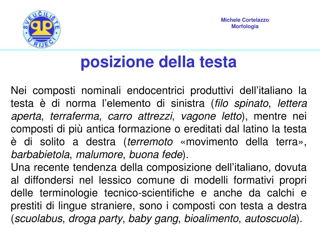 posizione della testa Nei composti nominali endocentrici produttivi dell’italiano la testa è di norma l’elemento di sinistra (filo spinato, lettera aperta, terraferma, carro attrezzi, vagone letto), mentre nei composti di più antica formazione o ereditati dal latino la testa è di solito a destra (terremoto «movimento della terra», barbabietola, malumore, buona fede). Una recente tendenza della composizione dell’italiano, dovuta al diffondersi nel lessico comune di modelli formativi propri delle terminologie tecnico-scientifiche e anche da calchi e prestiti di lingue straniere, sono i composti con testa a destra (scuolabus, droga party, baby gang, bioalimento, autoscuola).