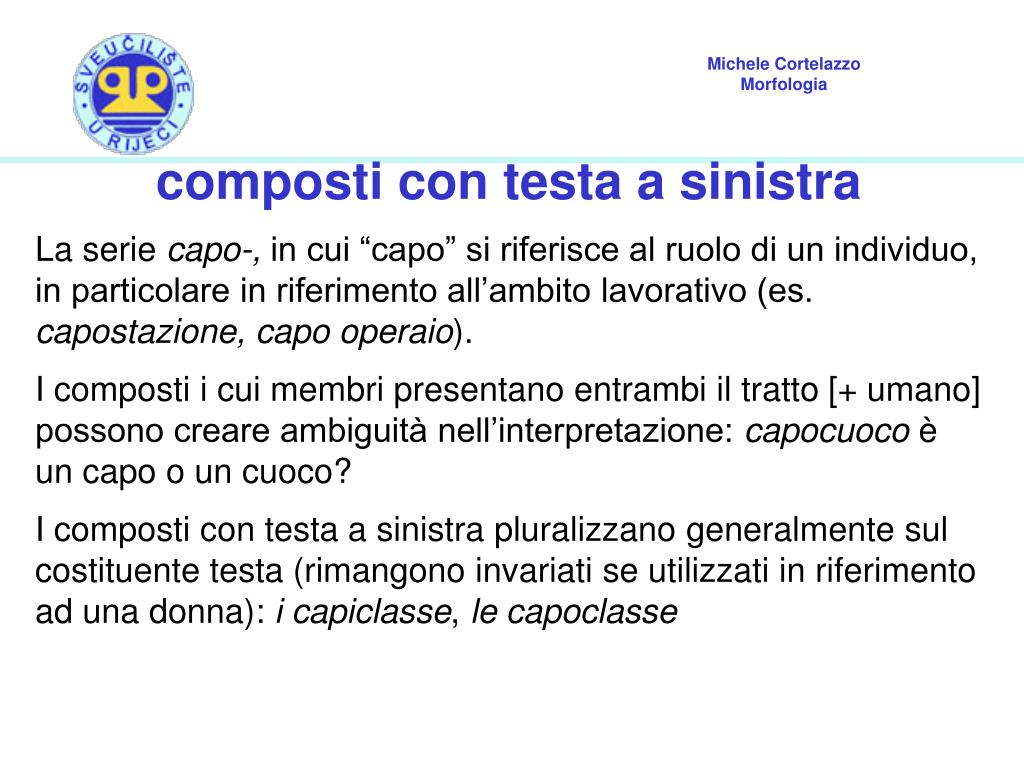 composti con testa a sinistra La serie capo-, in cui “capo” si riferisce al ruolo di un individuo, in particolare in riferimento all’ambito lavorativo (es. capostazione, capo operaio). I composti i cui membri presentano entrambi il tratto [+ umano] possono creare ambiguità nell’interpretazione: capocuoco è un capo o un cuoco? I composti con testa a sinistra pluralizzano generalmente sul costituente testa (rimangono invariati se utilizzati in riferimento ad una donna): i capiclasse, le capoclasse