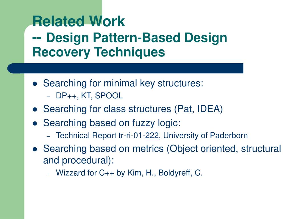 Related Work-- Design Pattern-Based Design Recovery Techniques • Searching for minimal key structures: • DP++, KT, SPOOL • Searching for class structures (Pat, IDEA) • Searching based on fuzzy logic: • Technical Report tr-ri-01-222, University of Paderborn • Searching based on metrics (Object oriented, structural and procedural): • Wizzard for C++ by Kim, H., Boldyreff, C.