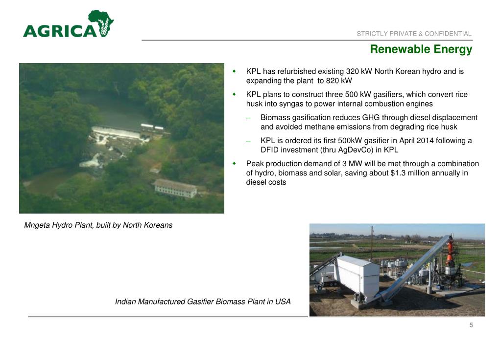 KPL has refurbished existing 320 kW North Korean hydro and is expanding the plant to 820 kW KPL plans to construct three 500 kW gasifiers, which convert rice husk into syngas to power internal combustion engines Biomass gasification reduces GHG through diesel displacement and avoided methane emissions from degrading rice husk KPL is ordered its first 500kW gasifier in April 2014 following a DFID investment (thru AgDevCo) in KPL Peak production demand of 3 MW will be met through a combination of hydro, biomass and solar, saving about $1.3 million annually in diesel costs STRICTLY PRIVATE & CONFIDENTIAL Renewable Energy Mngeta Hydro Plant, built by North Koreans Indian Manufactured Gasifier Biomass Plant in USA 5