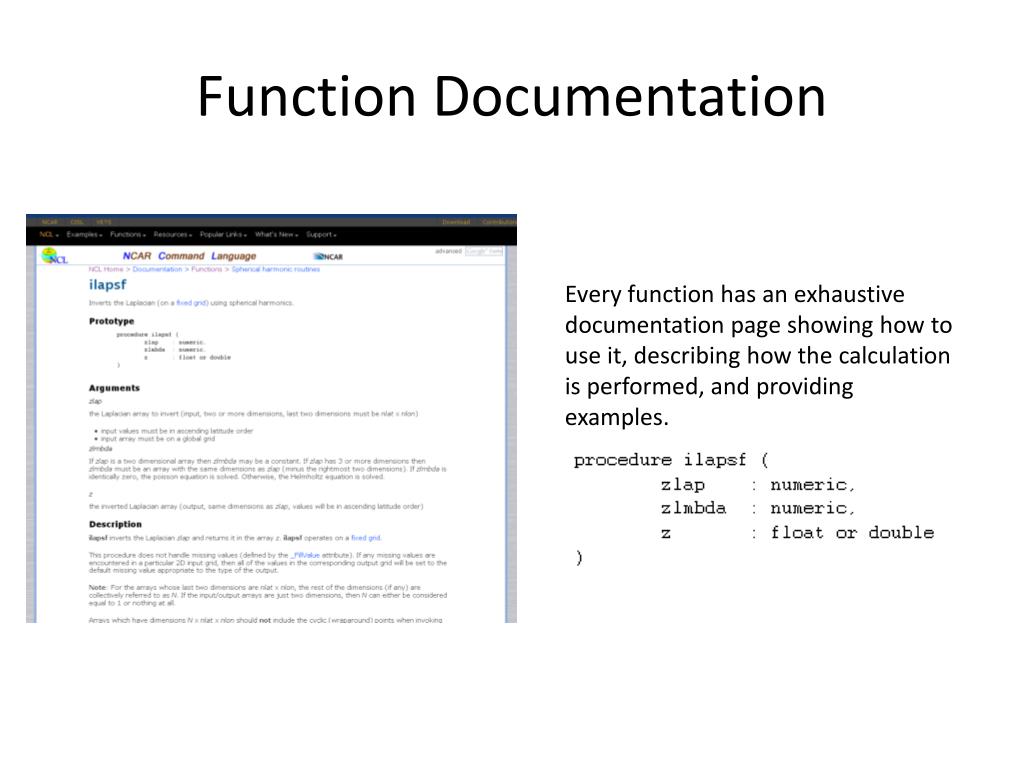 Function Documentation Every function has an exhaustive documentation page showing how to use it, describing how the calculation is performed, and providing examples.
