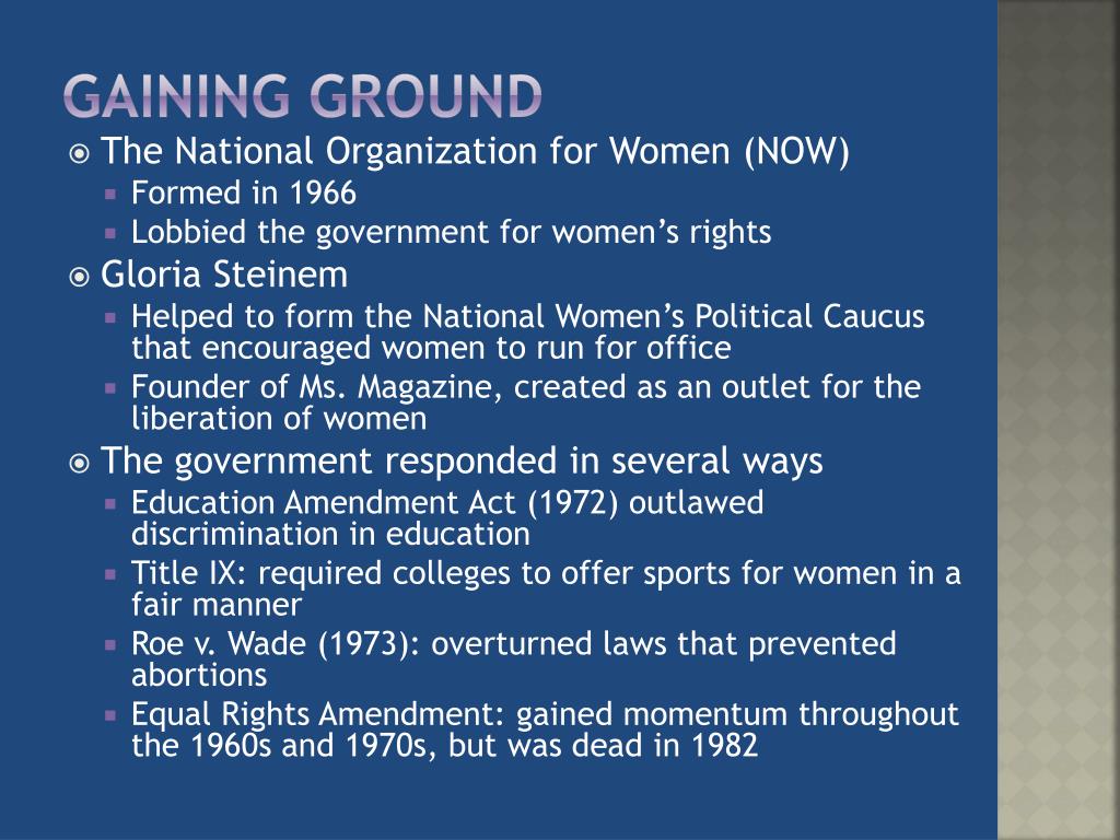 Gaining Ground • The National Organization for Women (NOW) • Formed in 1966 • Lobbied the government for women’s rights • Gloria Steinem • Helped to form the National Women’s Political Caucus that encouraged women to run for office • Founder of Ms. Magazine, created as an outlet for the liberation of women • The government responded in several ways • Education Amendment Act (1972) outlawed discrimination in education • Title IX: required colleges to offer sports for women in a fair manner • Roe v. Wade (1973): overturned laws that prevented abortions • Equal Rights Amendment: gained momentum throughout the 1960s and 1970s, but was dead in 1982