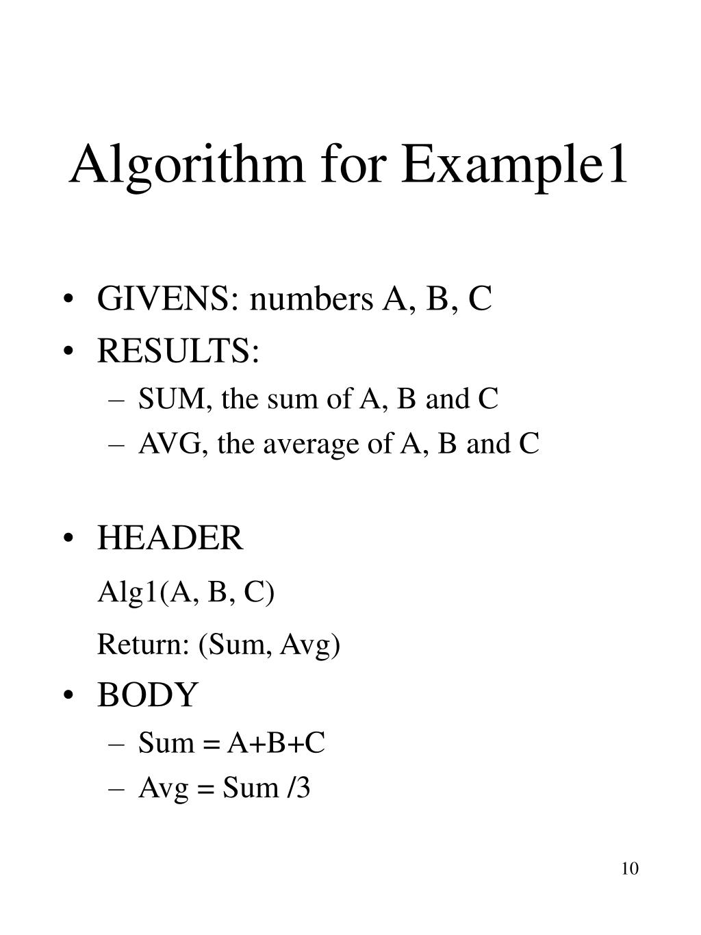 Algorithm for Example1 • GIVENS: numbers A, B, C • RESULTS: • SUM, the sum of A, B and C • AVG, the average of A, B and C • HEADER Alg1(A, B, C) Return: (Sum, Avg) • BODY • Sum = A+B+C • Avg = Sum /3