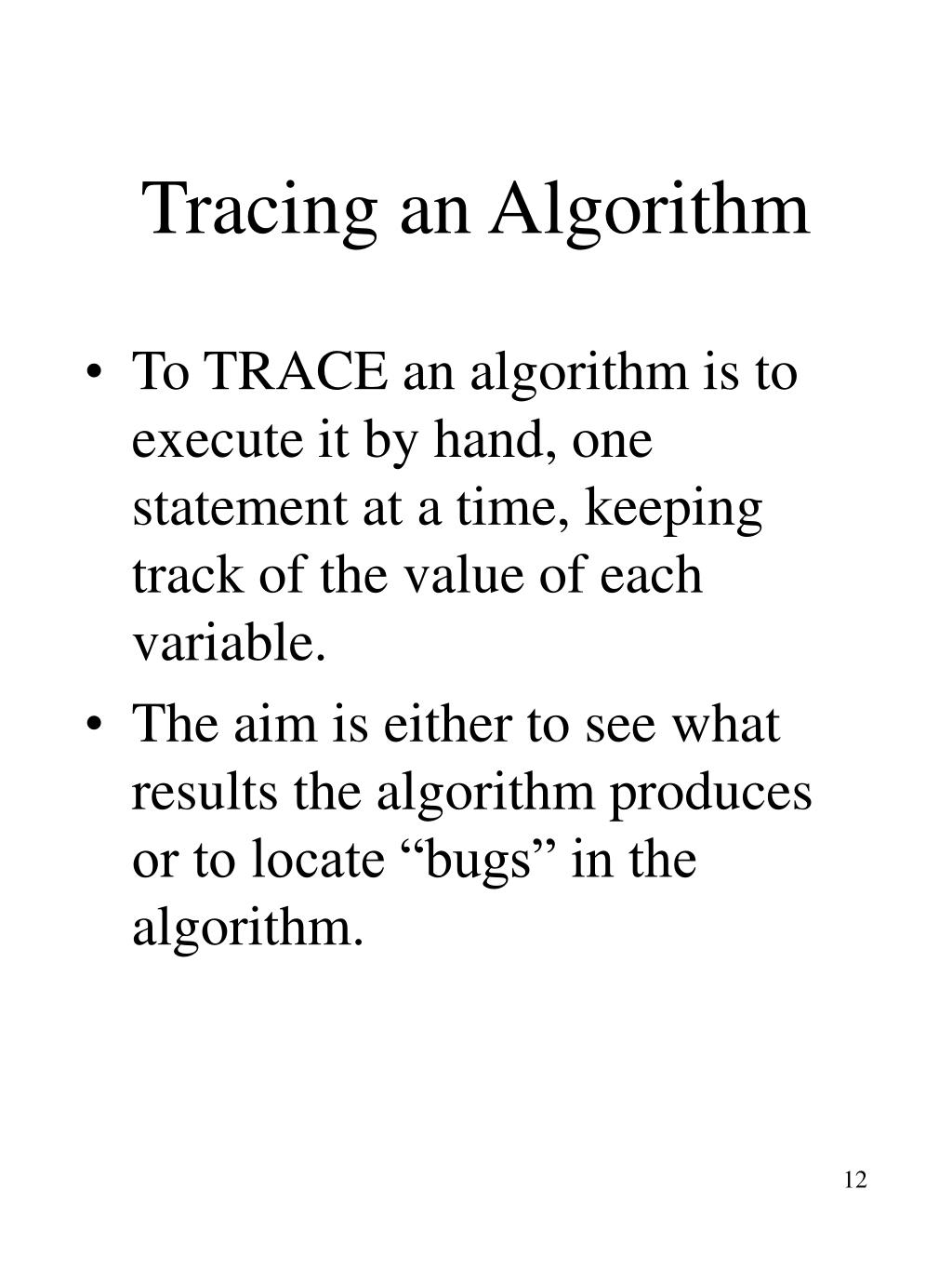 Tracing an Algorithm • To TRACE an algorithm is to execute it by hand, one statement at a time, keeping track of the value of each variable. • The aim is either to see what results the algorithm produces or to locate “bugs” in the algorithm.