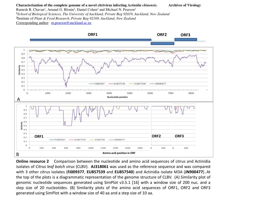 ORF1 ORF2 ORF3 Characterization of the complete genome of a novel citrivirus infecting Actinidia chinensis. Archives of Virology Ramesh R. Chavan1, Arnaud G. Blouin2, Daniel Cohen2 and Michael N. Pearson1 1School of Biological Sciences, The University of Auckland, Private Bag 92019, Auckland, New Zealand 2Institute of Plant & Food Research, Private Bag 92169, Auckland, New Zealand Corresponding author: m.pearson@auckland.ac.nz A ORF2 ORF3 ORF1 B Amino acid position in ORF Online resource 2 Comparison between the nucleotide and amino acid sequences of citrus and Actinidiaisolates of Citrus leaf botch virus (CLBV).AJ318061 was used as the reference sequence and was compared with 3 other citrus isolates (FJ009377, EU857539 and EU857540) and Actinidia isolate M3A (JN900477)..At the top of the plots is a diagrammatic representation of the genome structure of CLBV. (A) Similarity plot of genomic nucleotide sequences generated using SimPlot v3.5.1 [16] with a window size of 200 nuc. and a step size of 20 nucleotides. (B) Similarity plots of the amino acid sequences of ORF1, ORF2 and ORF3 generated using SimPlot with a window size of 40 aa and a step size of 10 aa.