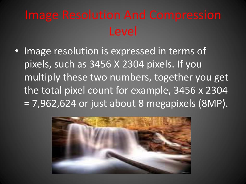 Image Resolution And Compression Level • Image resolution is expressed in terms of pixels, such as 3456 X 2304 pixels. If you multiply these two numbers, together you get the total pixel count for example, 3456 x 2304 = 7,962,624 or just about 8 megapixels (8MP).