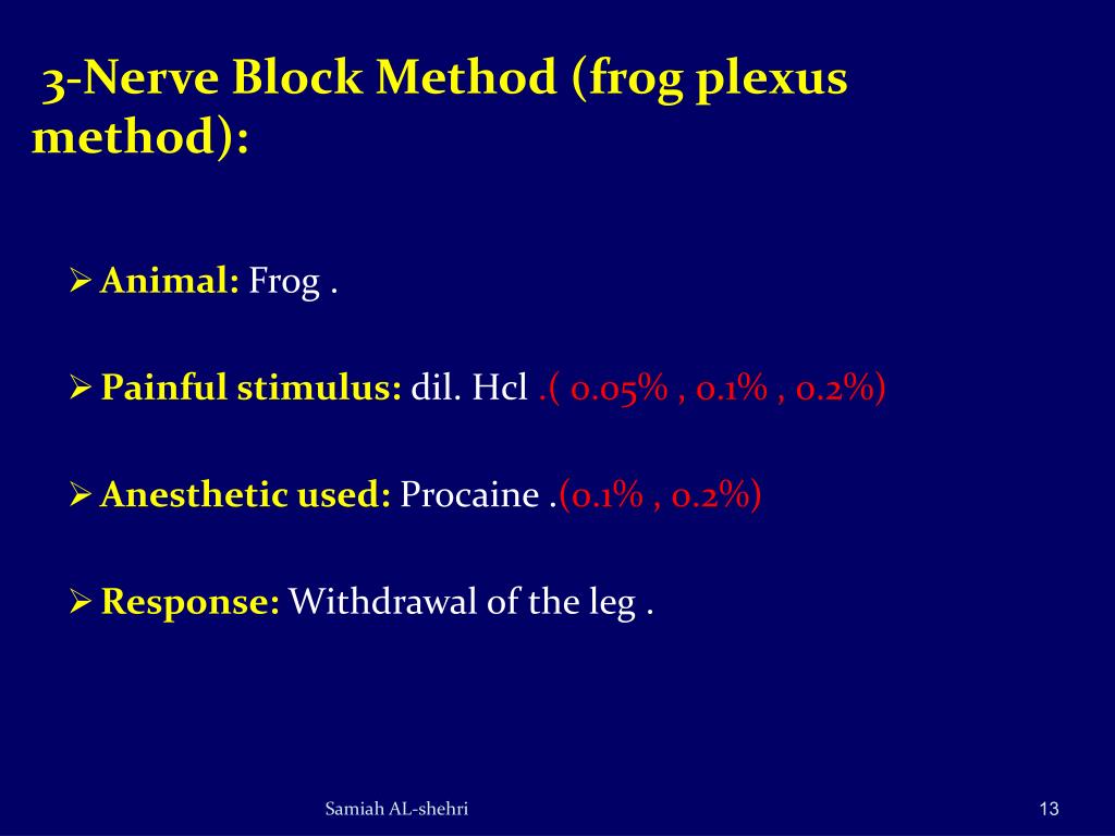 3-Nerve Block Method (frog plexus method): • Animal: Frog . • Painful stimulus: dil. Hcl.( 0.05% , 0.1% , 0.2%) • Anesthetic used: Procaine .(0.1% , 0.2%) • Response: Withdrawal of the leg . Samiah AL-shehri