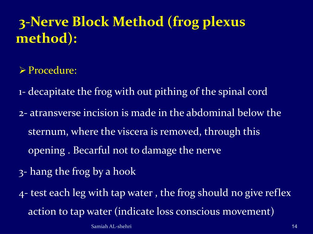 3-Nerve Block Method (frog plexus method): • Procedure: 1- decapitate the frog with out pithing of the spinal cord 2- atransverse incision is made in the abdominal below the sternum, where the viscera is removed, through this opening . Becarful not to damage the nerve 3- hang the frog by a hook 4- test each leg with tap water , the frog should no give reflex action to tap water (indicate loss conscious movement) Samiah AL-shehri