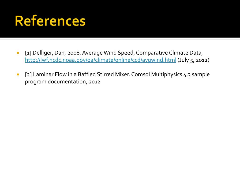 References • [1] Delliger, Dan, 2008, Average Wind Speed, Comparative Climate Data, http://lwf.ncdc.noaa.gov/oa/climate/online/ccd/avgwind.html (July 5, 2012) • [2] Laminar Flow in a Baffled Stirred Mixer. ComsolMultiphysics 4.3 sample program documentation, 2012