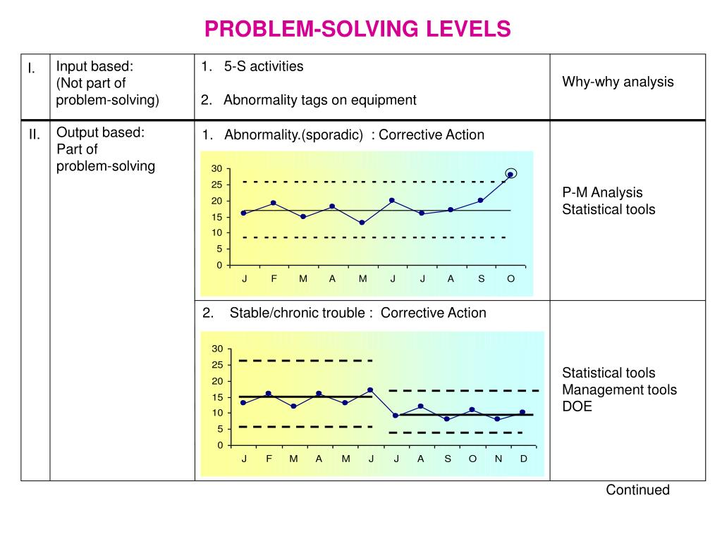 PROBLEM-SOLVING LEVELS I. Input based: (Not part of problem-solving) 1. 5-S activities 2. Abnormality tags on equipment Why-why analysis II. Output based: Part of problem-solving 1. Abnormality.(sporadic) : Corrective Action P-M Analysis Statistical tools 2. Stable/chronic trouble : Corrective Action Statistical tools Management tools DOE Continued