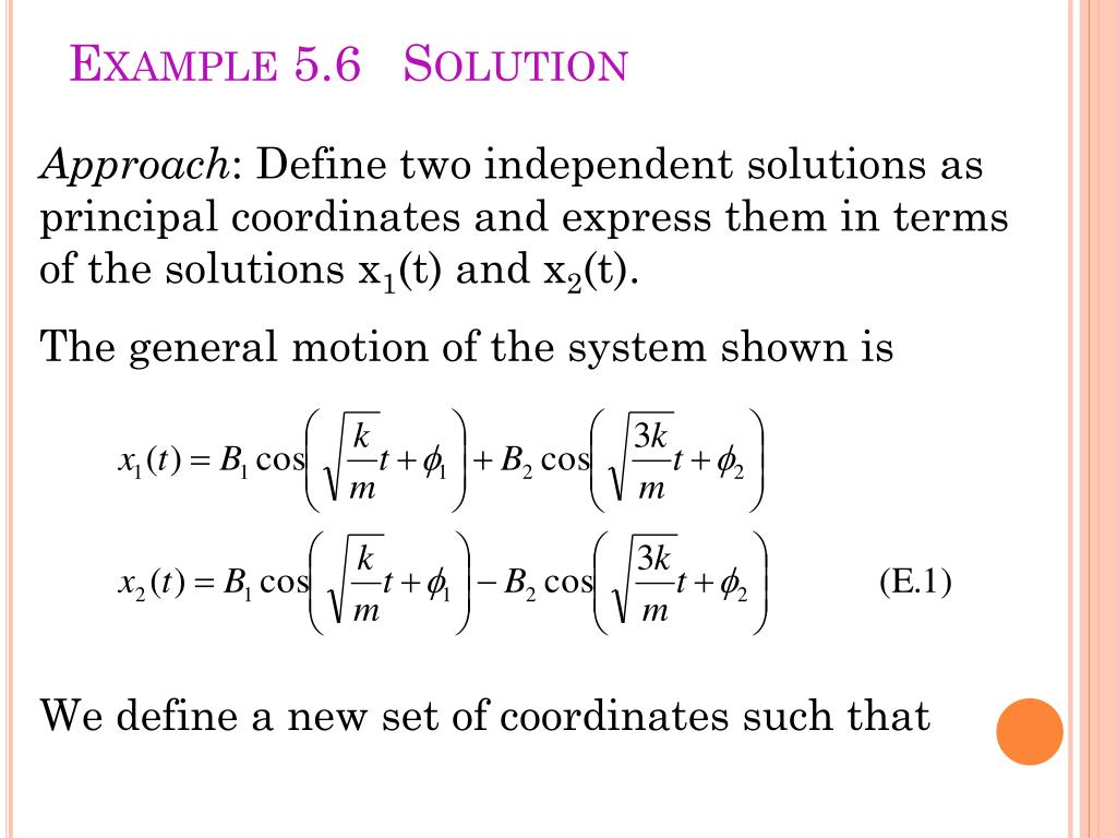 Example 5.6 Solution Approach: Define two independent solutions as principal coordinates and express them in terms of the solutions x1(t) and x2(t). The general motion of the system shown is We define a new set of coordinates such that
