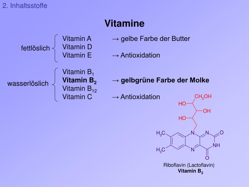 2. Inhaltsstoffe Vitamine fettlöslich Vitamin A → gelbe Farbe der Butter Vitamin D Vitamin E → Antioxidation Vitamin B1 Vitamin B2 → gelbgrüne Farbe der Molke Vitamin B12 Vitamin C → Antioxidation wasserlöslich