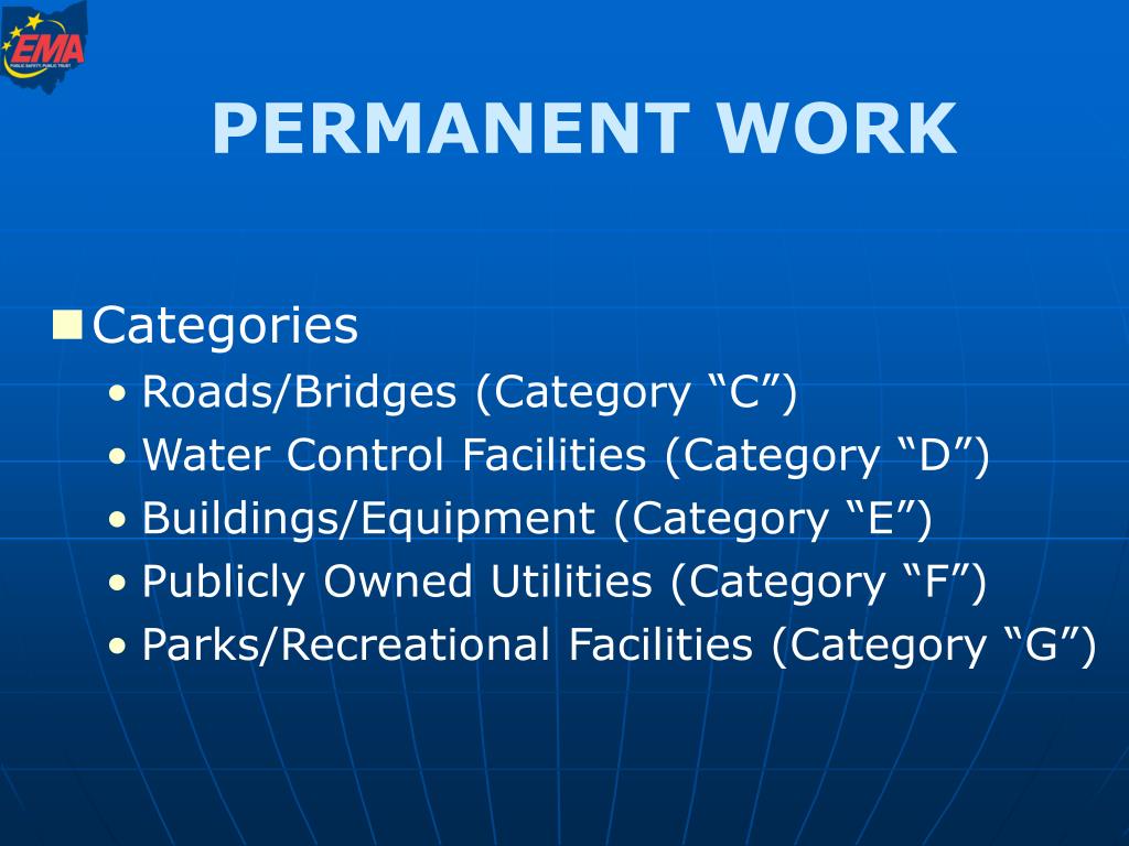 PERMANENT WORK • Categories • Roads/Bridges (Category “C”) • Water Control Facilities (Category “D”) • Buildings/Equipment (Category “E”) • Publicly Owned Utilities (Category “F”) • Parks/Recreational Facilities (Category “G”)