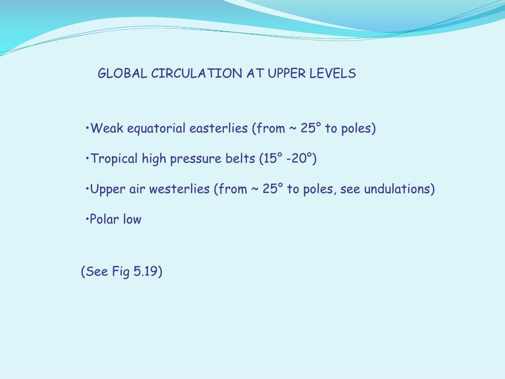 GLOBAL CIRCULATION AT UPPER LEVELS • Weak equatorial easterlies (from ~ 25° to poles) • Tropical high pressure belts (15° -20°) • Upper air westerlies (from ~ 25° to poles, see undulations) • Polar low (See Fig 5.19)