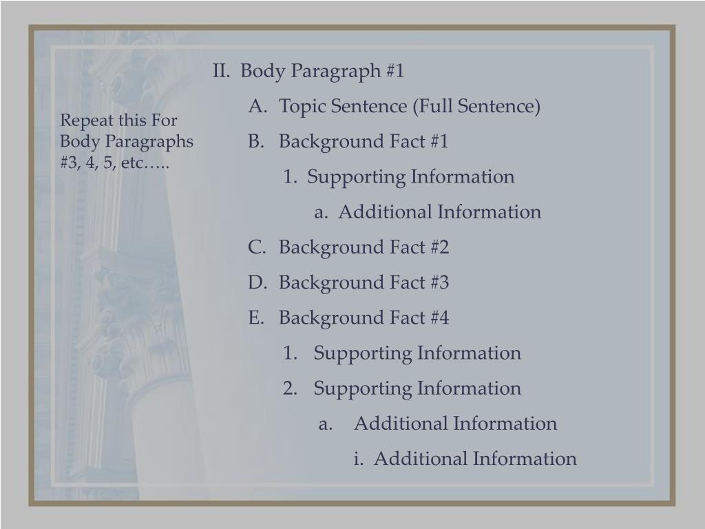 II. Body Paragraph #1 • Topic Sentence (Full Sentence) • Background Fact #1 • 1. Supporting Information • a. Additional Information • Background Fact #2 • Background Fact #3 • Background Fact #4 • Supporting Information • Supporting Information • Additional Information • i. Additional Information Repeat this For Body Paragraphs #3, 4, 5, etc…..
