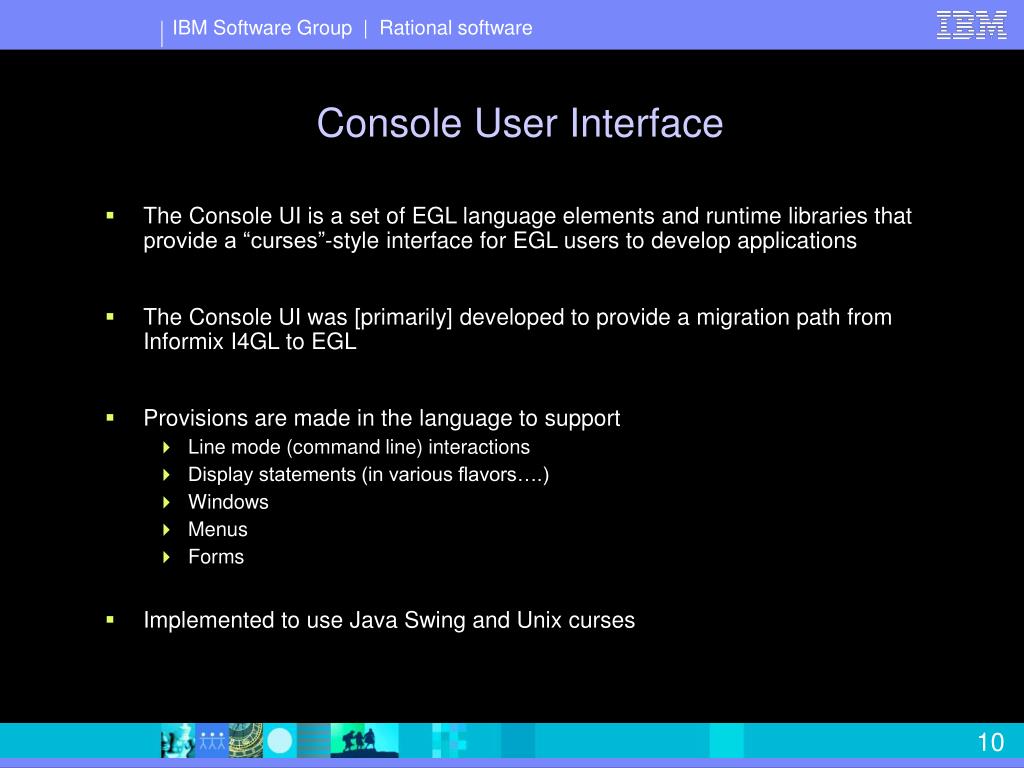 Console User Interface (cont…) • The Console UI operates (for the most part) on types and structures that have been created by EGL programmers • Console UI objects generate “events” which allows EGL programmers to control the runtime behavior based on user interaction • The Console UI runtime has been designed to • look the same as I4GL • behave the same as I4GL • Look-n-feel compatibility is crucial to the success of the I4GL to EGL migration effort
