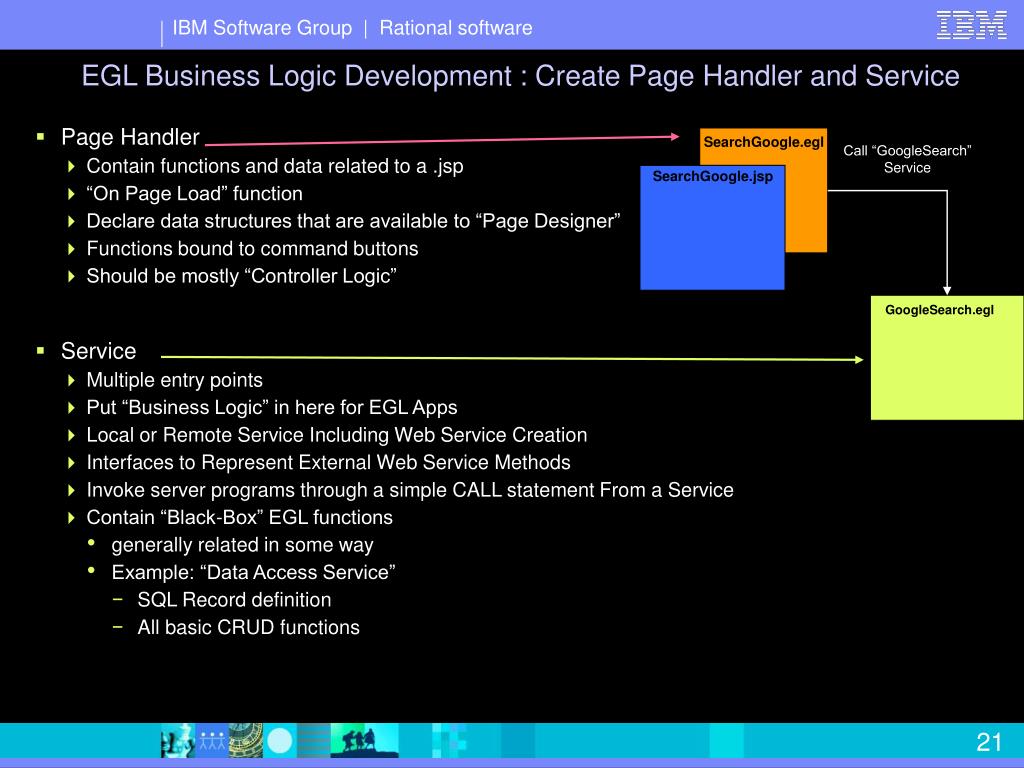 EGL Business Logic Development : Create Page Handler and Service SearchGoogle.egl Call “GoogleSearch” Service SearchGoogle.jsp • Page Handler • Contain functions and data related to a .jsp • “On Page Load” function • Declare data structures that are available to “Page Designer” • Functions bound to command buttons • Should be mostly “Controller Logic” • Service • Multiple entry points • Put “Business Logic” in here for EGL Apps • Local or Remote Service Including Web Service Creation • Interfaces to Represent External Web Service Methods • Invoke server programs through a simple CALL statement From a Service • Contain “Black-Box” EGL functions • generally related in some way • Example: “Data Access Service” • SQL Record definition • All basic CRUD functions GoogleSearch.egl