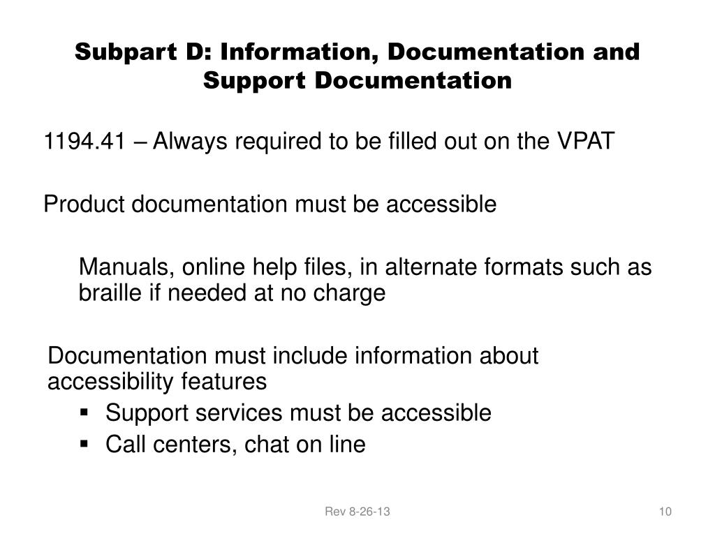 Subpart D: Information, Documentation and Support Documentation 1194.41 – Always required to be filled out on the VPAT Product documentation must be accessible Manuals, online help files, in alternate formats such as braille if needed at no charge Documentation must include information about accessibility features • Support services must be accessible • Call centers, chat on line Rev 8-26-13