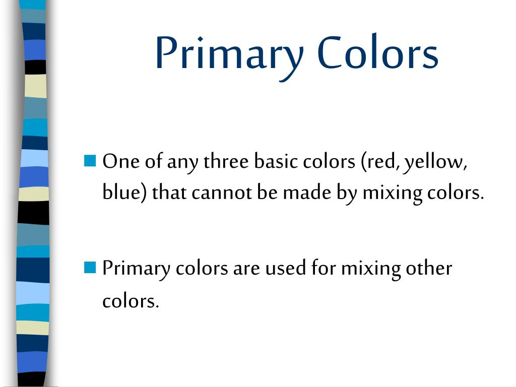 Primary Colors • One of any three basic colors (red, yellow, blue) that cannot be made by mixing colors. • Primary colors are used for mixing other colors.