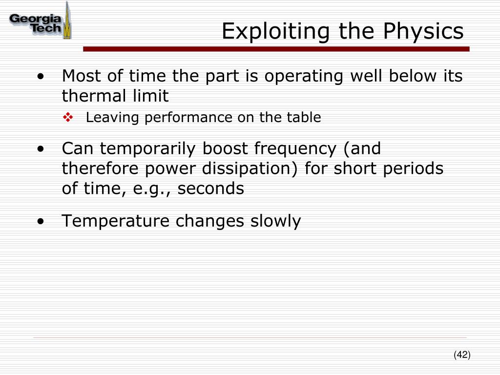 Exploiting the Physics • Most of time the part is operating well below its thermal limit • Leaving performance on the table • Can temporarily boost frequency (and therefore power dissipation) for short periods of time, e.g., seconds • Temperature changes slowly