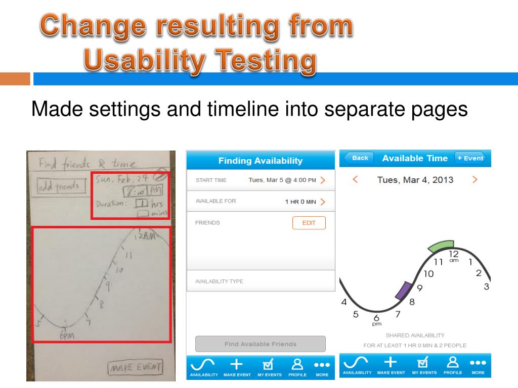 Usability Testing Some screens were clutter with information Couple titles on the buttons were confusing Overall able to complete the three tasks(Finding availability, Getting Recommendation, simple notification and feedback)