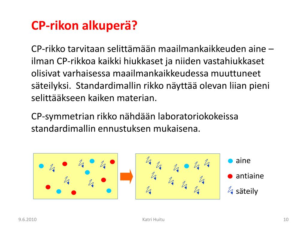 CP-rikon alkuperä? CP-rikko tarvitaan selittämään maailmankaikkeuden aine – ilman CP-rikkoa kaikki hiukkaset ja niiden vastahiukkaset olisivat varhaisessa maailmankaikkeudessa muuttuneet säteilyksi. Standardimallin rikko näyttää olevan liian pieni selittääkseen kaiken materian. CP-symmetrian rikko nähdään laboratoriokokeissa standardimallin ennustuksen mukaisena. aine antiaine säteily Katri Huitu