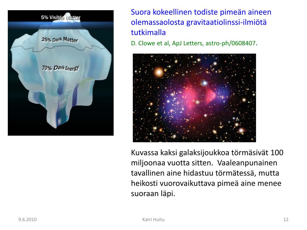 Suora kokeellinen todiste pimeän aineen olemassaolosta gravitaatiolinssi-ilmiötä tutkimallaD. Clowe et al, ApJ Letters, astro-ph/0608407. Kuvassa kaksi galaksijoukkoa törmäsivät 100 miljoonaa vuotta sitten. Vaaleanpunainen tavallinen aine hidastuu törmätessä, mutta heikosti vuorovaikuttava pimeä aine menee suoraan läpi. Katri Huitu