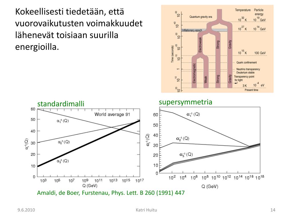Kokeellisesti tiedetään, että vuorovaikutusten voimakkuudet lähenevät toisiaan suurilla energioilla. supersymmetria standardimalli Amaldi, de Boer, Furstenau, Phys. Lett. B 260 (1991) 447 Katri Huitu