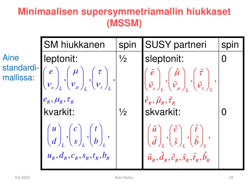 Minimaalisen supersymmetriamallin hiukkaset(MSSM) Ainestandardi-mallissa: Katri Huitu