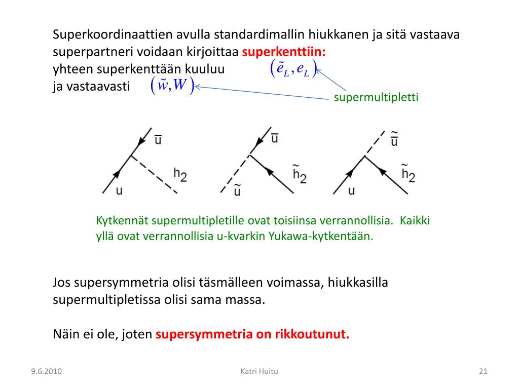 Superkoordinaattien avulla standardimallin hiukkanen ja sitä vastaava superpartneri voidaan kirjoittaa superkenttiin:yhteen superkenttään kuuluu ja vastaavasti supermultipletti Kytkennät supermultipletille ovat toisiinsa verrannollisia. Kaikki yllä ovat verrannollisia u-kvarkin Yukawa-kytkentään. Jos supersymmetria olisi täsmälleen voimassa, hiukkasilla supermultipletissa olisi sama massa. Näin ei ole, joten supersymmetria on rikkoutunut. Katri Huitu
