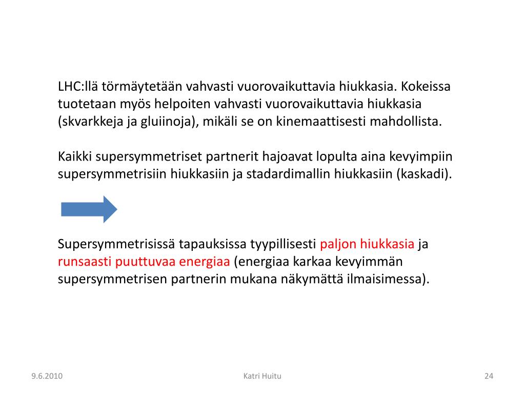 LHC:llätörmäytetään vahvasti vuorovaikuttavia hiukkasia. Kokeissa tuotetaan myös helpoiten vahvasti vuorovaikuttavia hiukkasia (skvarkkeja ja gluiinoja), mikäli se on kinemaattisesti mahdollista. Kaikki supersymmetriset partnerit hajoavat lopulta aina kevyimpiin supersymmetrisiin hiukkasiin ja stadardimallin hiukkasiin (kaskadi). Supersymmetrisissä tapauksissa tyypillisesti paljon hiukkasia ja runsaasti puuttuvaa energiaa (energiaa karkaa kevyimmän supersymmetrisen partnerin mukana näkymättä ilmaisimessa). Katri Huitu