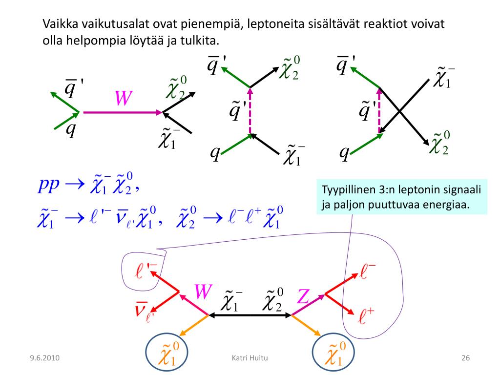 Vaikka vaikutusalat ovat pienempiä, leptoneita sisältävät reaktiot voivat olla helpompia löytää ja tulkita. Tyypillinen 3:n leptonin signaali ja paljon puuttuvaa energiaa. Katri Huitu