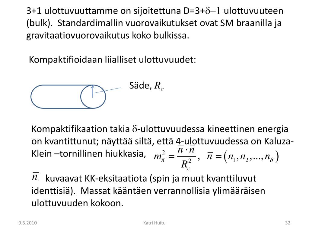 3+1 ulottuvuuttamme on sijoitettuna D=3+d+1 ulottuvuuteen (bulk). Standardimallin vuorovaikutukset ovat SM braanilla ja gravitaatiovuorovaikutus koko bulkissa. Kompaktifioidaan liialliset ulottuvuudet: Säde, Rc Kompaktifikaation takia d-ulottuvuudessa kineettinen energia on kvantittunut; näyttää siltä, että 4-ulottuvuudessa on Kaluza-Klein –tornillinen hiukkasia, kuvaavat KK-eksitaatiota (spin ja muut kvanttiluvut identtisiä). Massat kääntäen verrannollisia ylimääräisen ulottuvuuden kokoon. Katri Huitu
