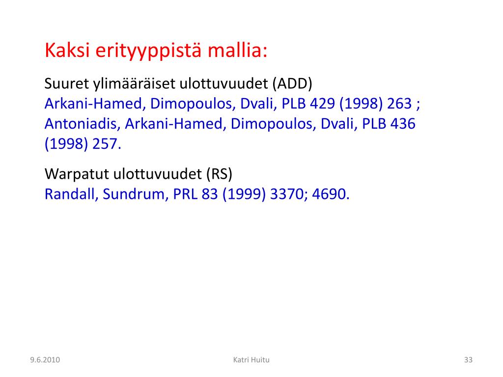 Kaksi erityyppistä mallia: Suuret ylimääräiset ulottuvuudet (ADD) Arkani-Hamed, Dimopoulos, Dvali, PLB 429 (1998) 263 ; Antoniadis, Arkani-Hamed, Dimopoulos, Dvali, PLB 436 (1998) 257. Warpatut ulottuvuudet (RS) Randall, Sundrum, PRL 83 (1999) 3370; 4690. Katri Huitu