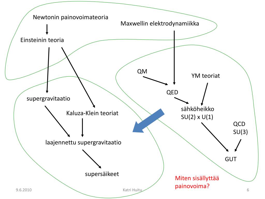 Newtonin painovoimateoria Maxwellin elektrodynamiikka Einsteinin teoria QM YM teoriat QED supergravitaatio sähköheikkoSU(2) x U(1) Kaluza-Kleinteoriat QCDSU(3) laajennettu supergravitaatio GUT supersäikeet Miten sisällyttää painovoima? Katri Huitu