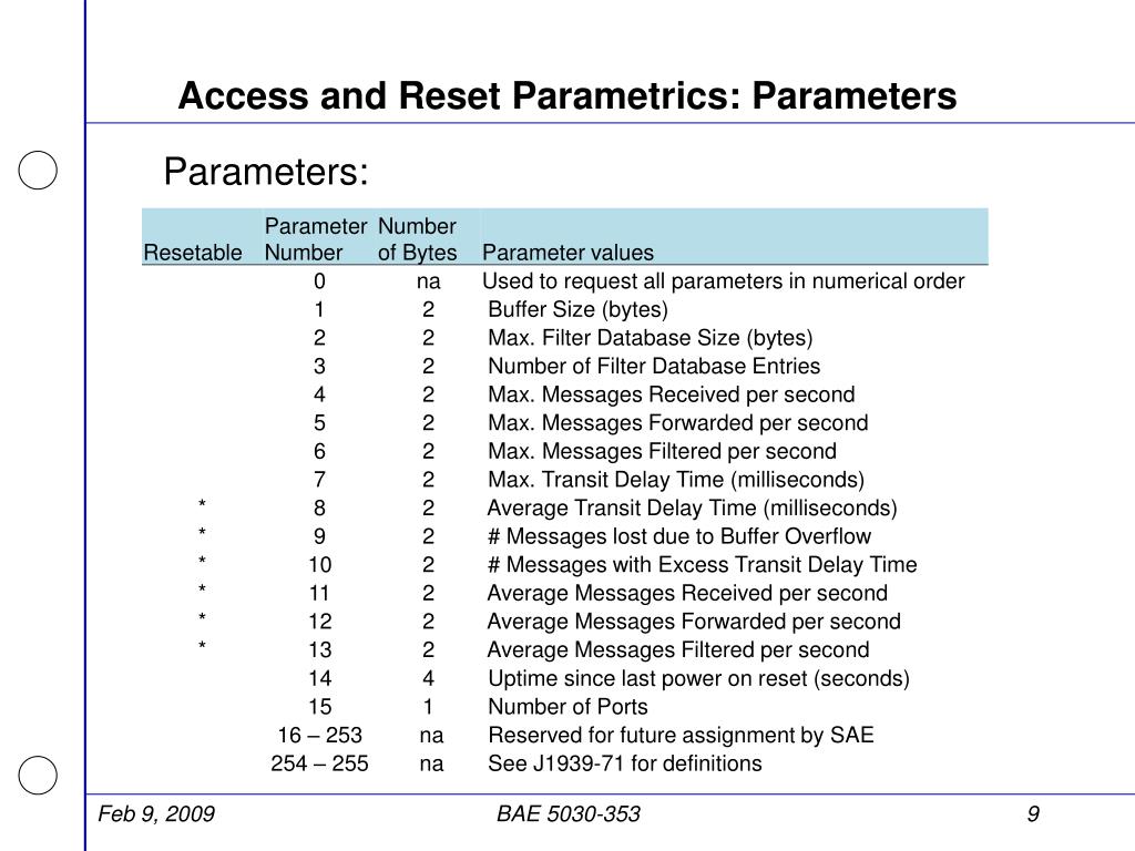 Access and Reset Parametrics: Parameters Parameters: BAE 5030-353
