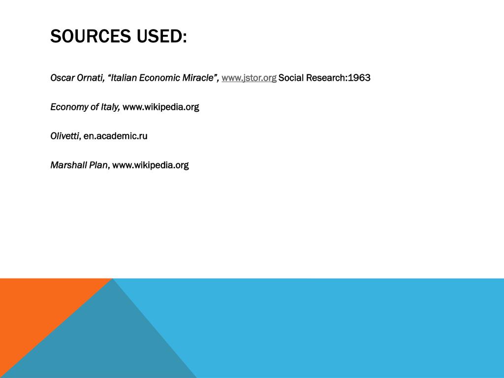 Sources used: • Oscar Ornati, “Italian Economic Miracle”, www.jstor.org Social Research:1963 • Economy of Italy, www.wikipedia.org • Olivetti, en.academic.ru • Marshall Plan, www.wikipedia.org