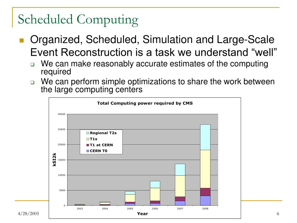 Scheduled Computing • Organized, Scheduled, Simulation and Large-Scale Event Reconstruction is a task we understand “well” • We can make reasonably accurate estimates of the computing required • We can perform simple optimizations to share the work between the large computing centers ISGC 2005 M.Ernst