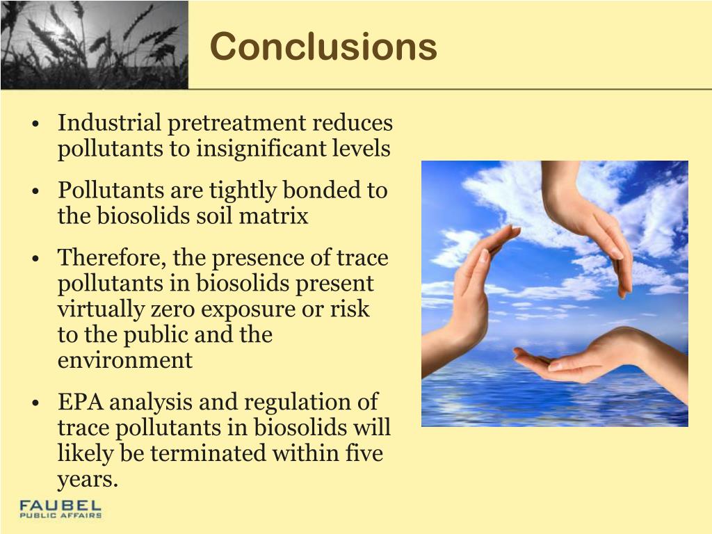 Conclusions • Industrial pretreatment reduces pollutants to insignificant levels • Pollutants are tightly bonded to the biosolids soil matrix • Therefore, the presence of trace pollutants in biosolids present virtually zero exposure or risk to the public and the environment • EPA analysis and regulation of trace pollutants in biosolids will likely be terminated within five years.