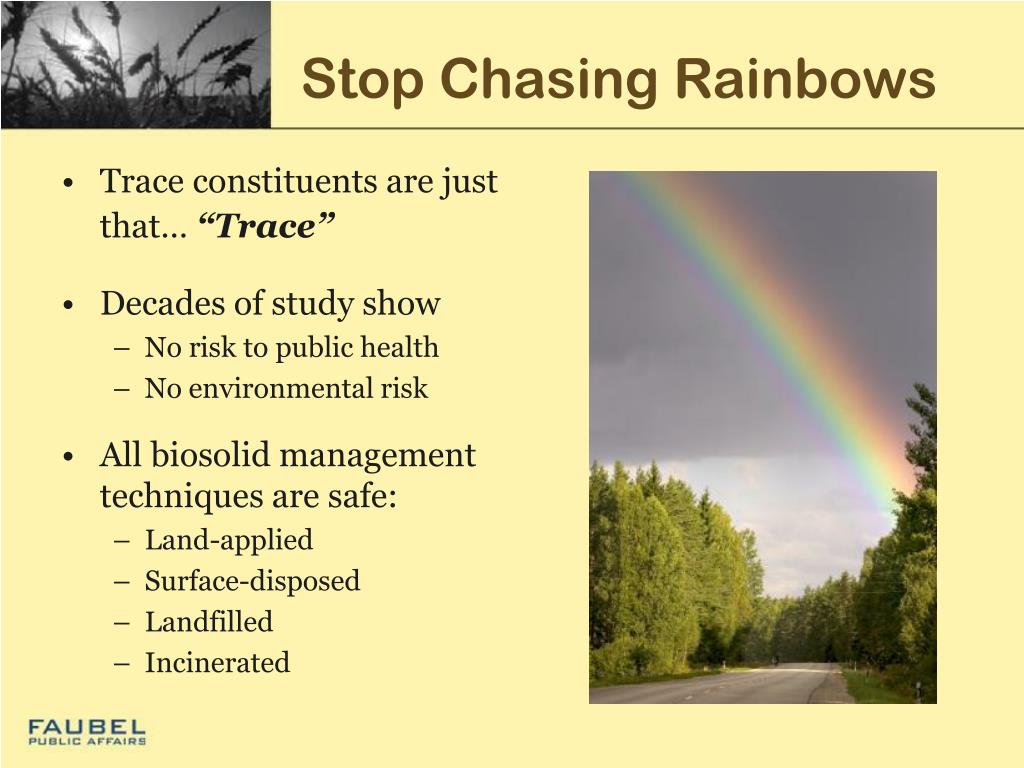 Stop Chasing Rainbows • Trace constituents are just that… “Trace” • Decades of study show • No risk to public health • No environmental risk • All biosolid management techniques are safe: • Land-applied • Surface-disposed • Landfilled • Incinerated