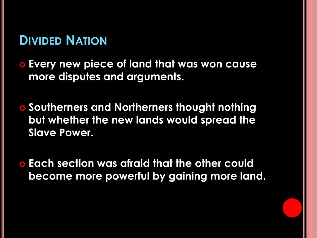 Divided Nation • Every new piece of land that was won cause more disputes and arguments. • Southerners and Northerners thought nothing but whether the new lands would spread the Slave Power. • Each section was afraid that the other could become more powerful by gaining more land.