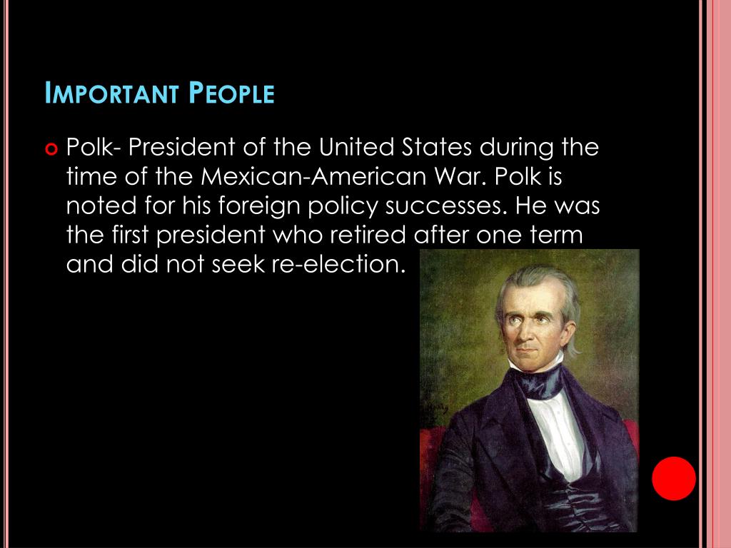 Important People • Polk- President of the United States during the time of the Mexican-American War. Polk is noted for his foreign policy successes. He was the first president who retired after one term and did not seek re-election.